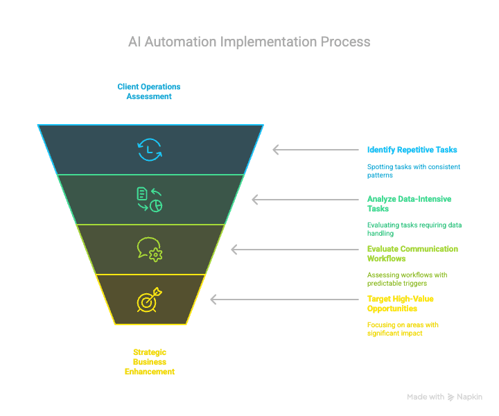 The process of integrating AI automation begins with strategic assessment of client operations to identify high-value implementation opportunities. The most impactful automation targets typically share common characteristics: repetitive manual processes with defined inputs and outputs, data-intensive tasks requiring consistent formatting or extraction, and communication workflows with predictable patterns and triggers.