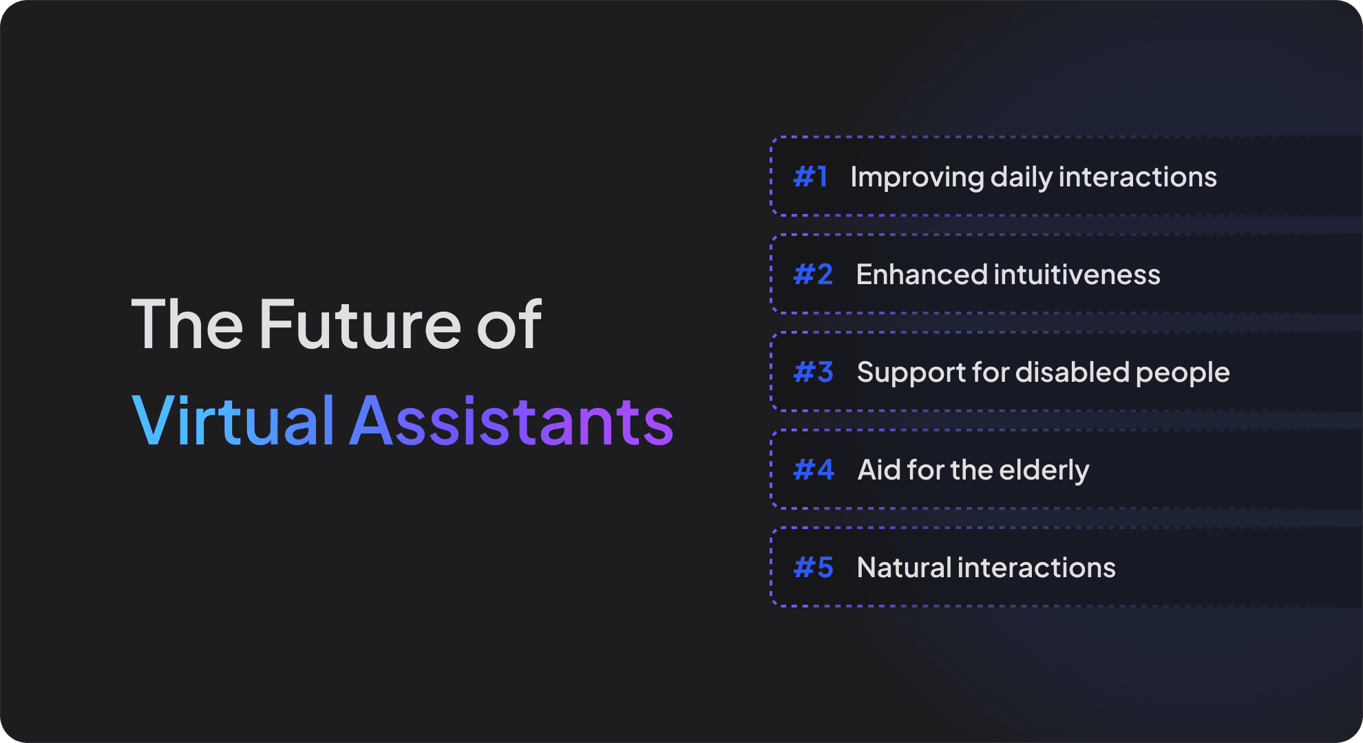 The future of virtual assistants looks incredibly promising. With significant improvements in intuitiveness and overall performance and capabilities, these advancements will enhance our daily interactions. They will provide essential support to individuals with disabilities and the elderly, and ultimately contribute to a more inclusive society.