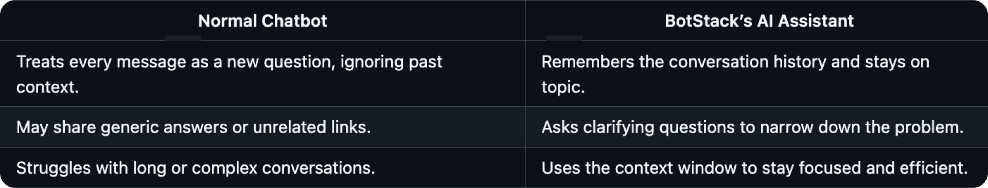 Have you ever talked to a customer support tool that felt robotic, gave unrelated answers, or forgot what you said earlier? This happens when the tool lacks a context window. At BotStacks, our AI Assistants are different.